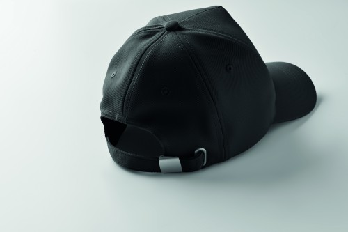 RPET 5 panel baseball cap in polyester 210 gm/m2 with silver steel buckle. 4 embroidered eyelets in matching colour. Size 7 1/4.