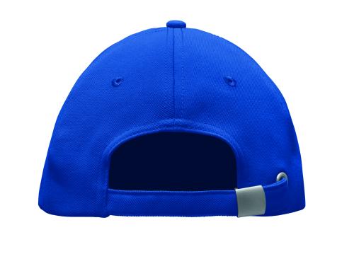 RPET 5 panel baseball cap in polyester 210 gm/m2 with silver steel buckle. 4 embroidered eyelets in matching colour. Size 7 1/4.