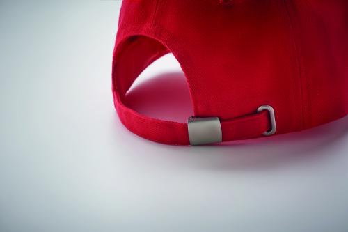 5 panel baseball cap in heavy brushed twill cotton 260 gm/m2 with silver steel buckle. 4 embroidered eyelets in matching colour. Size 7 1/4.