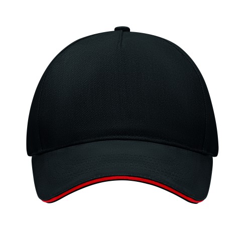 5 panel baseball cap in heavy brushed twill cotton 260 gm/m2 with silver steel buckle. 4 embroidered eyelets in matching colour. Size 7 1/4.