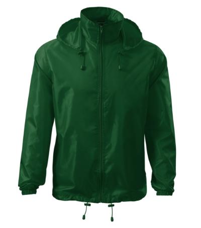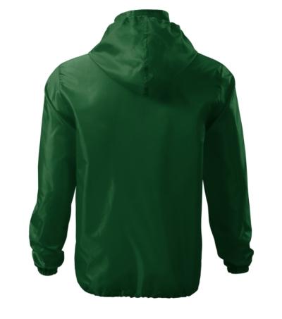 lightweight windproof fabric, full-length coil zipper, hidden hood in the collar, hood and bottom hem adjustable by elastic drawstring, welt pockets, folds into separate small bag for easy carry