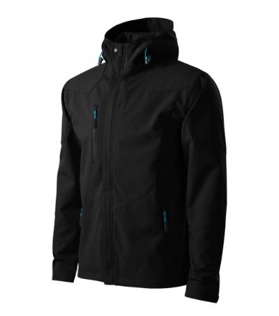 3-layer softshell with membrane, impressive softshell texture, Nanotex® finish preventing water penetration, full-length coil zipper with flap, drawstring hood, hood and sleeve hems adjustable by velcro, pockets with reverse coil zipper, breast pocket, curved and slightly prolonged back part, contrast elements, Care information for softshell fabric