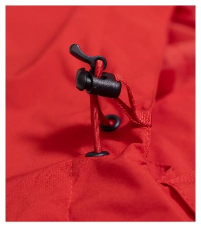 lightweight waterproof fabric with membrane, BIONIC FINISH® ECO finish preventing water penetration, cut with side parts, waterproof zipper with chin protection, removable drawstring hood, sleeve hems adjustable by velcro, side pockets with reverse coil zipper, inner chest pocket with velcro, taped seams, access for branding in side lining, curved and slightly prolonged back part, the lower side hem with elastic band, ventilation at the back part, reflective elements