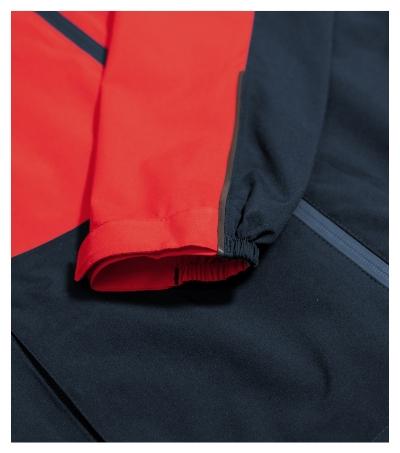 lightweight waterproof fabric with membrane, BIONIC FINISH® ECO finish preventing water penetration, cut with side parts, waterproof zipper with chin protection, removable drawstring hood, sleeve hems adjustable by velcro, side pockets with reverse coil zipper, inner chest pocket with velcro, taped seams, access for branding in side lining, curved and slightly prolonged back part, the lower side hem with elastic band, ventilation at the back part, reflective elements