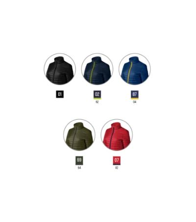 foldable into the inner pocket, lightweight quilted warm fabric , cut fitted by side parts, full-length molded zipper with chin protection, pockets with molded zipper, inner pocket with velcro, access for branding in side lining, trimmed by elastic stripe