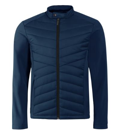 combination of quilted and softshell fabric, cut with side parts, stand up collar with snap button, full-length coil zipper, side pockets with coil zipper, inner breast zip pocket , access for branding in back lining