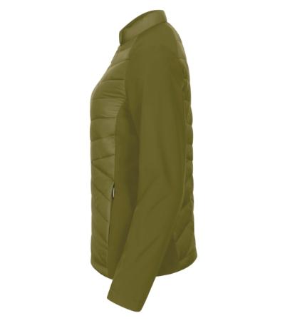 combination of quilted and softshell fabric, cut fitted by side parts, stand up collar with snap button, full-length coil zipper, side pockets with coil zipper, inner breast zip pocket , access for branding in back lining