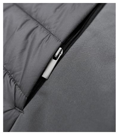 combination of quilted and softshell fabric, cut with side parts, full-length coil zipper with chin protection, side pockets with coil zipper, inner breast zip pocket , curved and slightly prolonged back part, access for branding in back lining