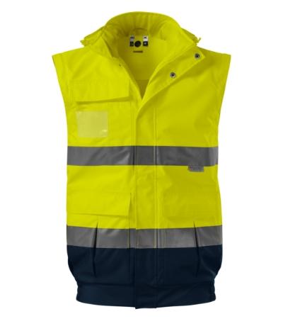 high visibility clothing, multipurpose use 4 in 1 in two-colour design, Upper jacket:, waterproof, breathable, fluorescent fabric, certified retroreflective bands 3M, full-length molded zipper with flap, removable hood with reinforced peak, hidden in the collar, hood and bottom hem adjustable by elastic drawstring, removable sleeves, sleeve hems with elastic band, adjustable with velcro, bellow pockets with flap and side pockets, breast zip pocket with placket, pocket for ID card and pens, taped seams, access for branding in back lining, certification according to the standards EN ISO 20471/A1 (class 3, 1), EN 343 (class 4:1) a EN ISO 13688, Inner fleece:, removable inner fleece jacket, insulating fluorescent fabric, certified retroreflective stripes 3M, full-length molded zipper, pockets with molded zipper, trimmed by elastic stripe, antipilling finish on both sides, certification according to the standards EN ISO 20471/A1 (class 2) and EN ISO 13688
