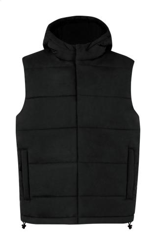 Wind and water resistant, padded bodywarmer vest with double front zip and button closure. With hood and side pockets. 100% polyester.
