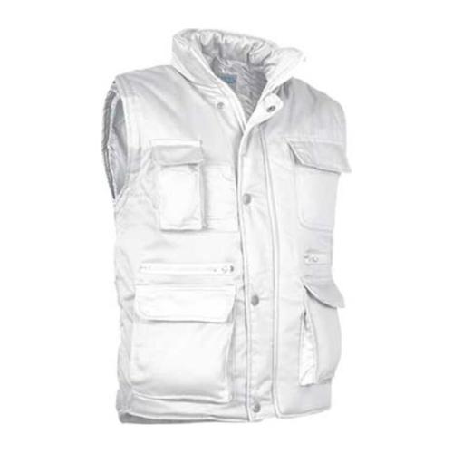 Outside 65% polyester, 35% cotton, 200 g/m² twill fabric. Padded 100% polyester 220 g/m². 8 outside pockets. 1 inside pocket. 2 pen compartments. Right chest pocket for phone. High collar with total zip. Back lateral regulators. Back wide area for printing. Back side longer. Arm hole inside cover. 20 units per box: 1 size, 1 color. Individual bag.