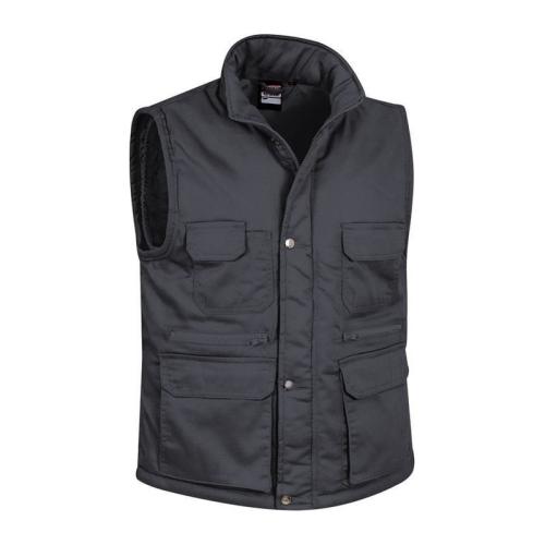 Outside 65% polyester, 35% cotton, 200 g/m² twill fabric. Padded 100% polyester 220 g/m². 8 outside pockets. 1 inside pocket. 2 pen compartments. Right chest pocket for phone. High collar with total zip. Back lateral regulators. Back wide area for printing. Back side longer. Arm hole inside cover. 20 units per box: 1 size, 1 color. Individual bag.