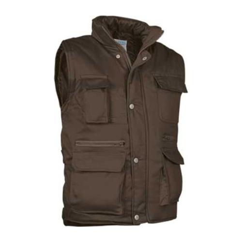Outside 65% polyester, 35% cotton, 200 g/m² twill fabric. Padded 100% polyester 220 g/m². 8 outside pockets. 1 inside pocket. 2 pen compartments. Right chest pocket for phone. High collar with total zip. Back lateral regulators. Back wide area for printing. Back side longer. Arm hole inside cover. 20 units per box: 1 size, 1 color. Individual bag.