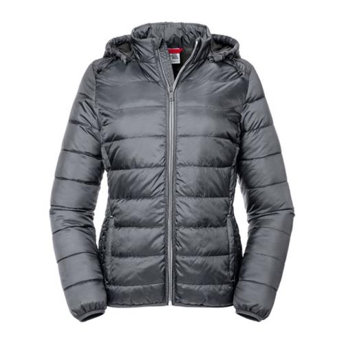 100% Polyester women's hooded jacket. Wash at or below 30°C. Fluorine and PFC free, Eco-efficient padding. 2 side pockets and 1 zipped inside pocket, removable hood. 66 g/m²