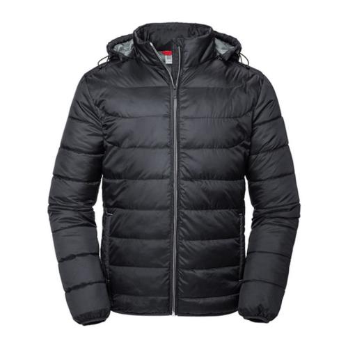 100% Polyester men's hooded jacket. Wash at or below 30°C. Fluorine and PFC free, Eco-efficient padding. 2 side pockets and 1 zipped inside pocket, removable hood. 66 g/m²