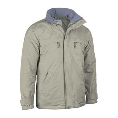 Outside fabric rip stop system with PVC coating. Waterproof treatment. Padded 100% polyester 220 grs/m2. Inside taffeta and polar fleece lining. 2 flap chest pockets with zip. 2 bottom front pockets with zip. Sleeve cuffs with velcro. Hood with adjus