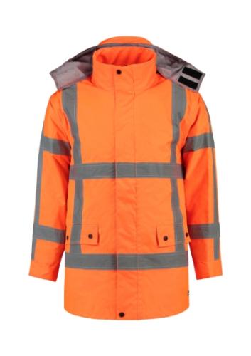 high visibility clothing, waterproof, windproof and breathable fabric, retroreflective bands, removable hood, ventilation pushbuttons under armpits, inner breast pockets, a 2-way open-ended zipper, waterproof zippers, taped seams, removable thermal lining, certification according to the standards EN ISO 20471/A1 (class 3), EN 343 (class 3:1), Tricorp item number: 403005
