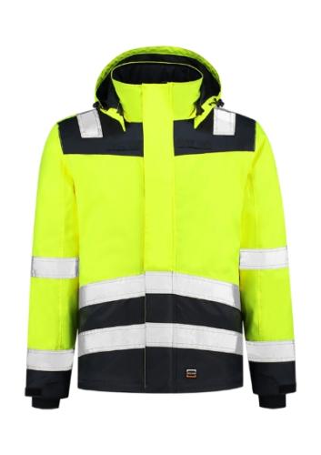 high visibility clothing, waterproof, windproof and breathable fabric, water-repelent, retroreflective bands, removable hood, full-length molded zipper with chin protection and flap, 2 front pockets with velcro and flap, 3 inner breast pockets, sleeve hems adjustable by velcro, tricot cuff with thumb opening, bottom hem adjustable by elastic drawstring, access for branding in a back lining part, extended back (retractable), certification according to the standards EN ISO 20471/A1 (class 2), EN 343 (class 3:1), Tricorp item number: 403023, AVAILABLE ON REQUEST TO OUR SALES DEPARTMENT