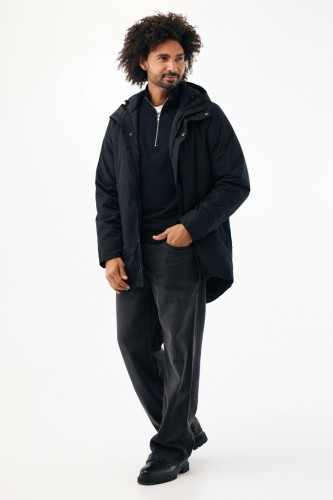 Unisex padded waterproof parka, made from 100% recycled polyester. The jacket is 4.000 mm waterproof, breathable and wind resistant. It has all features of a classic parka: longer back length, back slit, 2-way CF reversed zipper, covered by an extra front placket with four hidden snaps, clean sleeve cuffs with an extra inside half cuff, hood with stoppers at inside collar, horizontal deco seams. It is padded with 100% recycled polyester sheets and is lined with fine taffeta. On the inside there is a hidden zip at bottom hem and left wearer’s chest for easy decoration. Full garment is stitched with recycled polyester sewing thread. At back neck there is a tear-off size label with an iqoniq craft hangtag, care label at the left inside side seam. The use of genuine recycled fabric material and environmental impact claims are guaranteed, by using the AWARE™ disruptive physical tracer and blockchain technology. By scanning the QR code, you will gain access to a dedicated digital passport.