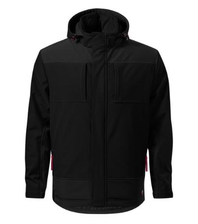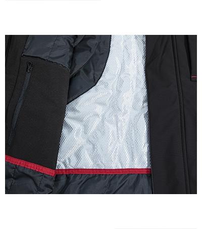 3-layer warm softshell with membrane, thermal reflective zone, full-length zipper with chin protection and flap, removable, adjustable hood with lining, hood and bottom hem adjustable by elastic drawstring, adjustable sleeve hems with velcro, pockets with waterproof reverse coil zipper, patch zipper pockets, inner breast zip pocket , access for branding in side lining, curved and slightly prolonged back part, contrast elements, inner fleece with antipilling finish
