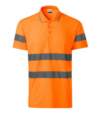 high visibility clothing, fluorescent polyester on the outer side, cotton on the inner side, certified retroreflective bands 3M, cut with side seams, 1:1 rib knit collar with a contrast stripe, placket with 3 buttons in the shell fabric colour, inner neckline with a shell fabric tape, fixing shoulder seams, certification according to the standards EN ISO 20471/A1 (class 2) and EN ISO 13688