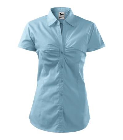 back part with a single yoke and darts, waist darts, breast decorated with tucks, two-piece open-neck shirt collar, front parts finished by placket, buttons in the shell fabric colour (1 spare extra), curved bottom edge