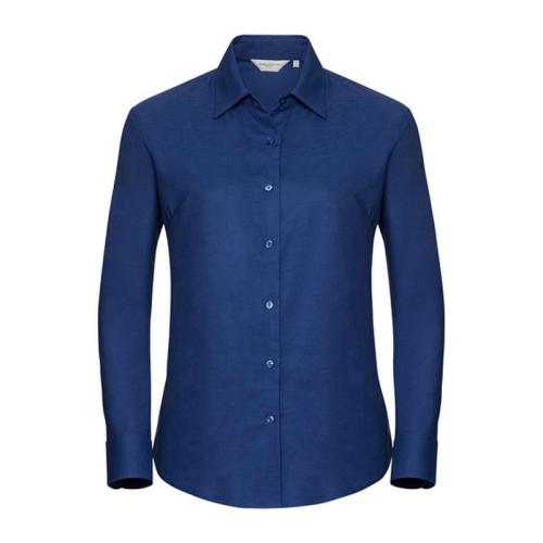 70% cotton, 30% polyester women's long-sleeved shirt. 40° washable, suitable for tumble drying, easy wear. Tailored fit, classic blouse collar, rounded hem, replacement buttons, darts on the chest and back for good fit long sleeve shirt. 135g/m²