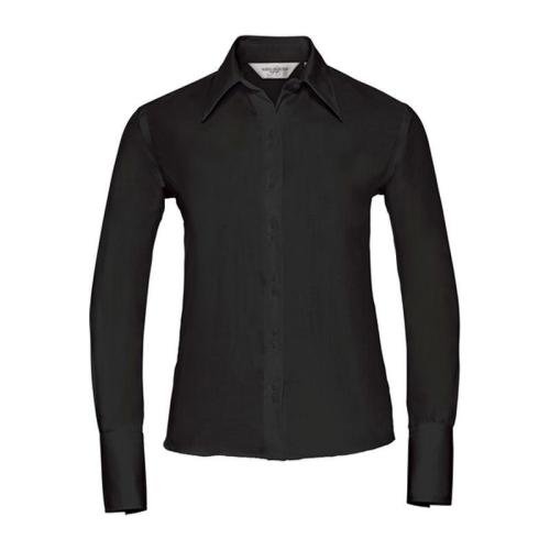 100% cotton-micro-twill women's long-sleeved shirt. 40° washable, suitable for tumble drying, non iron. Tailored fit, generously cut collar with long tips, flared sleeves with cuffs and button, double stud closure, replacement buttons, innovative fabric that keeps the blouse fresh and in shape all day. 120g/m²
