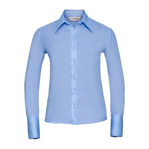 100% cotton-micro-twill women's long-sleeved shirt. 40° washable, suitable for tumble drying, non iron. Tailored fit, generously cut collar with long tips, flared sleeves with cuffs and button, double stud closure, replacement buttons, innovative fabric that keeps the blouse fresh and in shape all day. 120g/m²