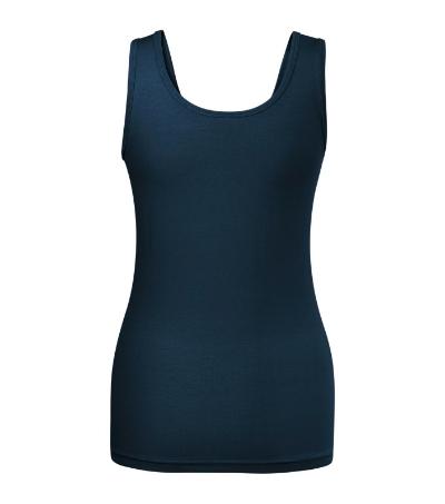 stretch fabric for better dimensional stability, slim fit cut with side seams, deeper round neckline, neckline and armholes trimmed with shell fabric, wider straps