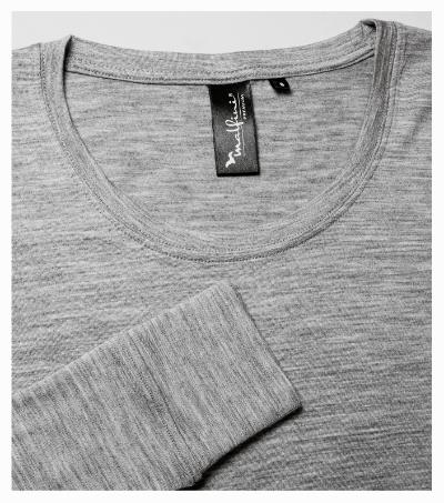 extra-fine merino wool, wrinkle-free and highly breathable fabric, thermoregulating and antibacterial features, the ability of moisture wicking and odor absorption, slim fit cut with side seams, deeper round neckline, narrow neckline hem from shell fabric, inner back neckline with a shell fabric tape, fixing shoulder seams, long sleeves with cuffs, drying horizontally recommended