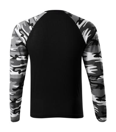 cut with side seams, narrow 1:1 rib knit neckline hem with 5 % elastane, inner back neckline with a tape in 01 colour, long raglan sleeves in camouflage colour