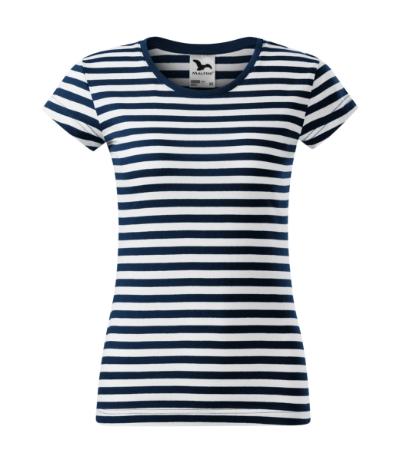 white and navy blue stripes, slight fit cut with side seams, deeper round neckline, narrow 1:1 rib knit neckline hem with 5 % elastane, inner back neckline with a shell fabric tape, fixing shoulder seams, shorter sleeves