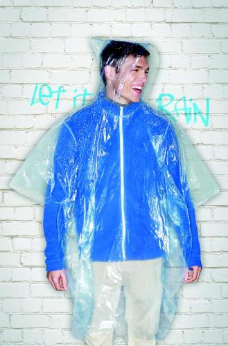 Foldable plastic poncho with attached hood, packed in a transparent polybag.