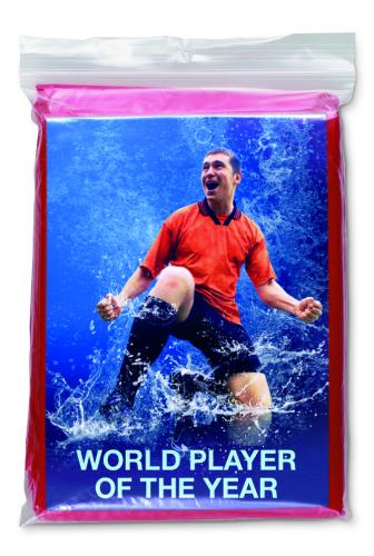 Foldable plastic poncho with attached hood, packed in a transparent polybag.