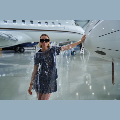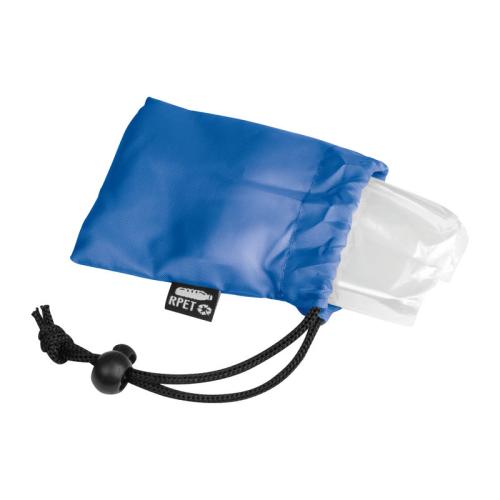Transparent rain poncho with RPET pouch and carrying strap.