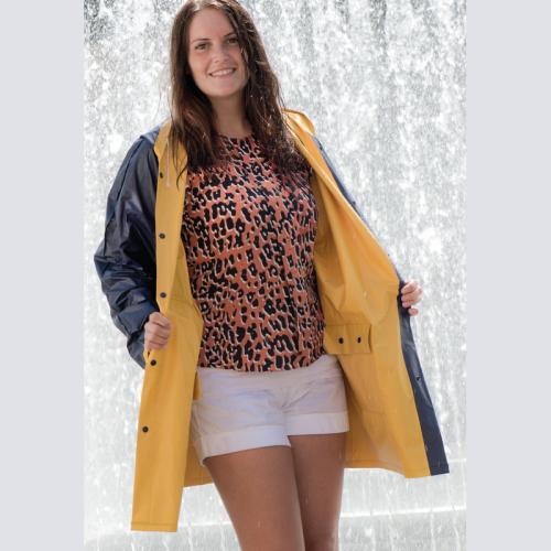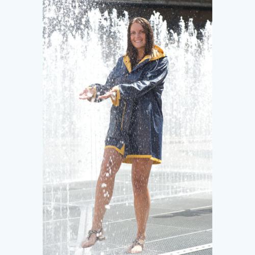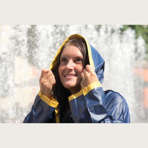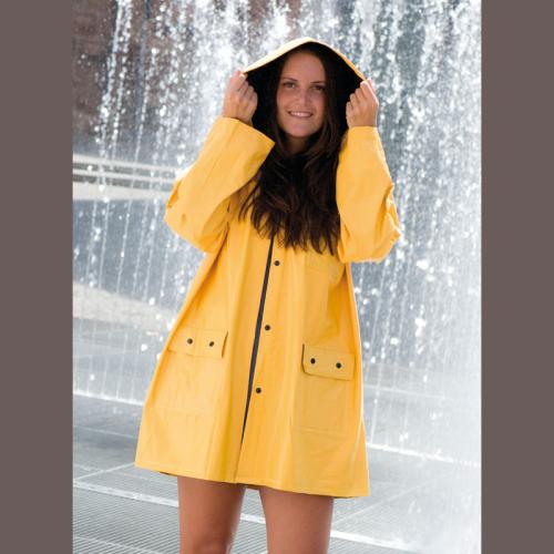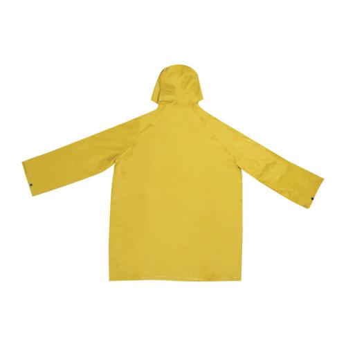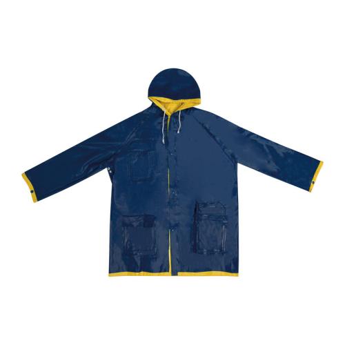 Bicolour reversible raincoat, made of PVC, in standard XL size with pushbuttons and hood.