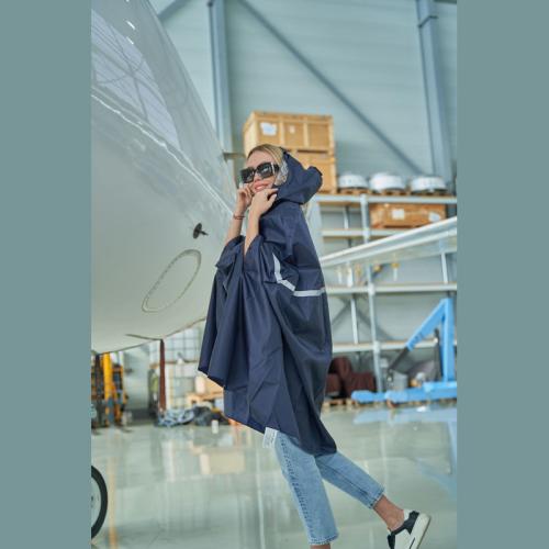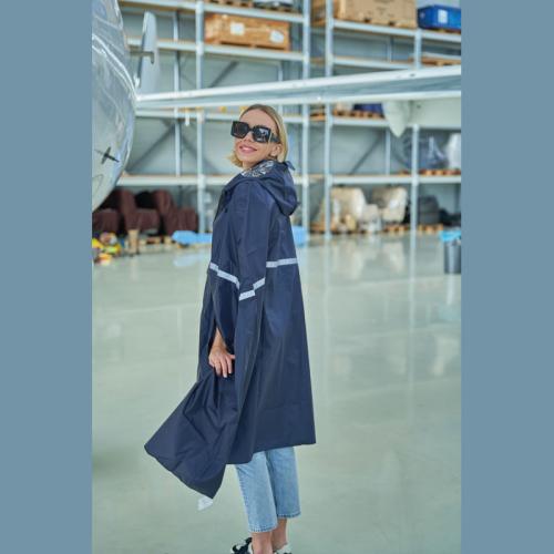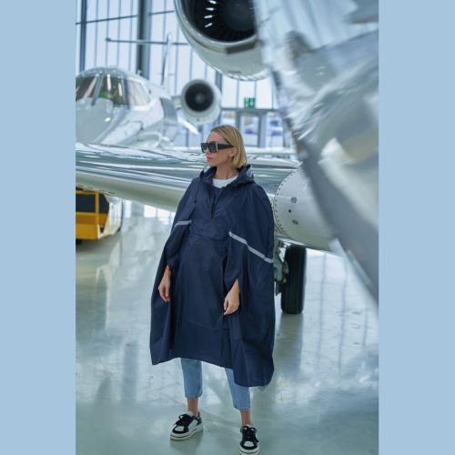Foldable rain poncho with reflective stripe and a drawstring for the hood, which can be folded into a fanny pack. Perfect for stowing away, this poncho should always be with you.