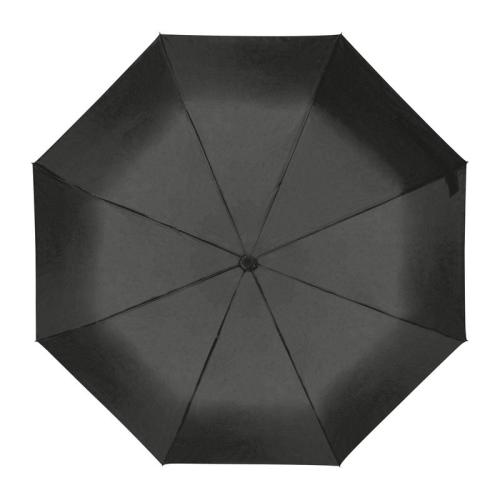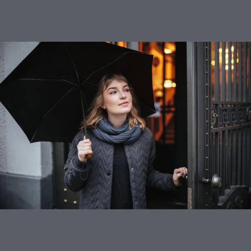 Automatic pocket umbrella with fibreglass frame, cover made of recycled PET bottles, wooden handle and wrist strap.