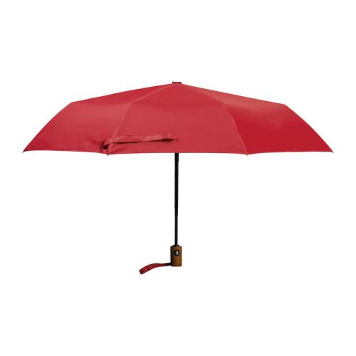 Automatic pocket umbrella with fibreglass frame, cover made of recycled PET bottles, wooden handle and wrist strap.