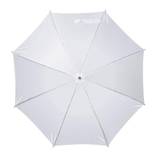 Automatic umbrella made of 190T polyester with curved wooden handle and wooden tips.