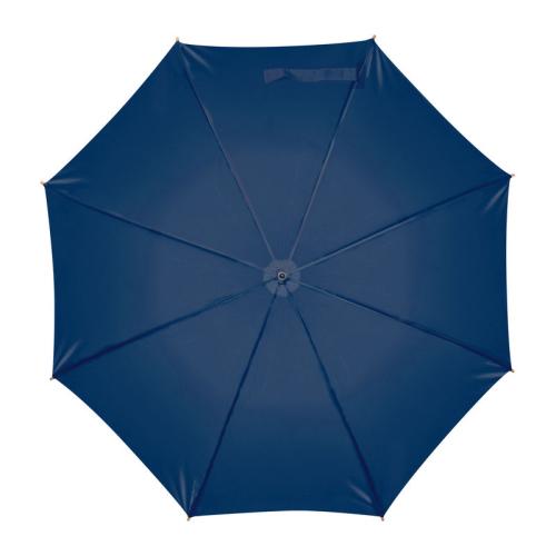 Automatic umbrella made of 190T polyester with curved wooden handle and wooden tips.