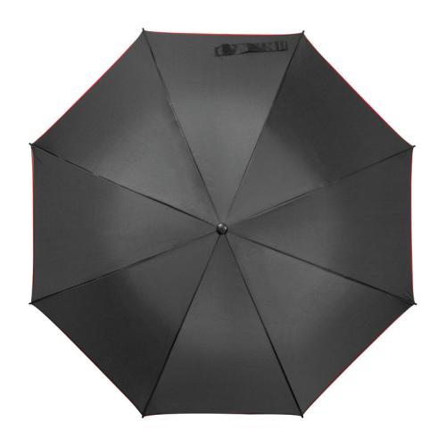 Black stick umbrella made of 190T pongee with coloured edge, automatic opening and fibreglass poles.