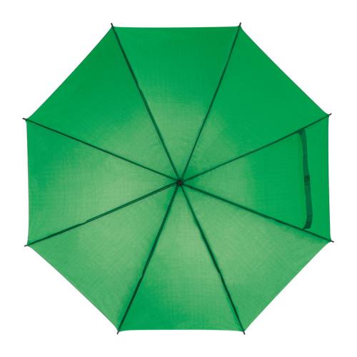 Automatic walking-stick umbrella with wooden handle and metal tops.