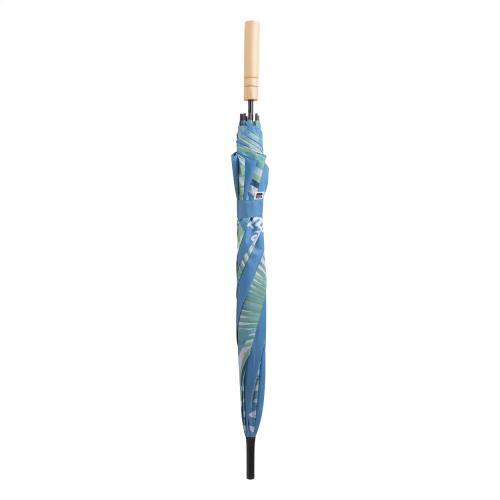 Custom made, 8 panel automatic umbrella with metal shaft, fibreglass ribs and wooden handle. 190T RPET pongee. With distinctive RPET label and sublimation printed graphics on all panels. MOQ: 50 pcs.
