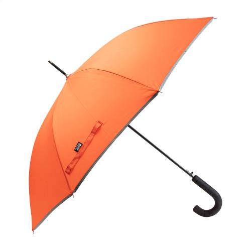 Automatic, windproof umbrella with 8 panels and reflective trim. With metal frame, fibreglass ribs and EVA handle. 190T RPET pongee. With distinctive RPET label. For promotional use only, the product does not qualify as a Personal Protective Equipment.