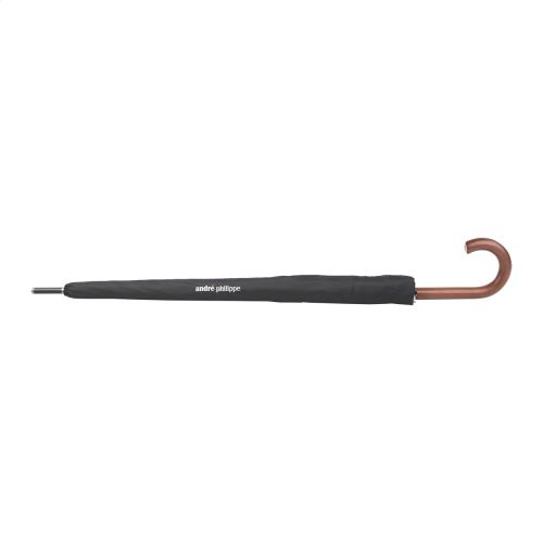 Automatic, windproof, black and grey striped umbrella with 8 panels, wooden handle, metal shaft and fibreglass ribs. 190T pongee. In branded carry case. André Philippe brand product.