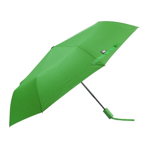 Full automatic (open/close), windproof folding umbrella with 8 panels in matching colour pouch. With metal frame, fibreglass ribs and rubberized handle. 190T RPET pongee. With distinctive RPET label.
