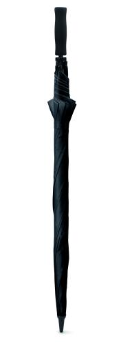 30 inch manual open windproof umbrella in 190T polyester with fiberglass shaft and ribs. Black plastic tips and top. Straight black EVA handle. Manual closure.