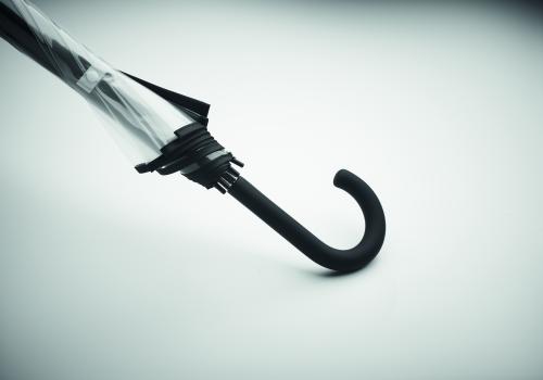 23 inch straight umbrella in POE with piping and 1 panel in polyester for printing area. Manual open. Fiberglass, ribs and frame. Chrome plated shaft with plastic tips. Rubber finished handle.